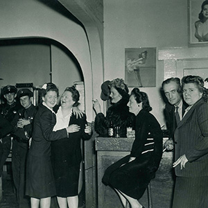 MARGE IN CHARGE: Marge’s Tavern once occupied the corner of Alma and Almaden in the 1930s and 40s. Proprietor Marjorie Bertlow is one of the two women embracing in the middle of the photo. She’s the woman on the right, standing close to the bar.