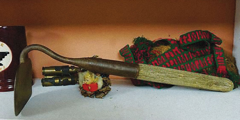 San Jose artist Carlos Pérez used the short-handled tool to weed potato, peanut and sugar beets fields near Stockton, where he moved with his mother and brother from Mexico City in the early 1960s. “When my mom passed away, I found it in the house,” he says.