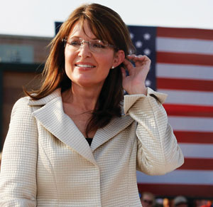But the star of the show was clearly Palin, clad in high-heeled sandals, a snug black skirt, and a purple suit jacket with the requisite American flag pin on her lapel. After watching far too much footage of Palin these past two years (yes, I do need a life), one never knows which Sarah Palin will show-up: the angry, vicious Palin (who delivered a demagogic speech just last week in San Diego); the giddy, nearly vacuous Palin (who recently appeared in an interview on Newsmax), the stunned, cross-eyed Palin (of Katie Couric fame), or “America’s sweetheart,” as the Washington Post‘s Chris Cillizza generously dubbed her (following her speech at the Republican National Convention in Minneapolis).