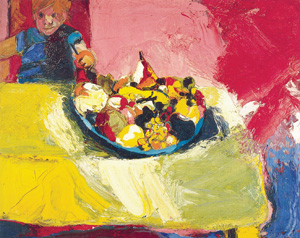The act of piling up pigment tends to overwhelm the illusionism of narrative and figurative painting, but Joan Brown manages to have her abstraction and eat it too with Noel at the Table With a Large Bowl of Fruit (1963). The sumptuous blobby fruits are barely outlined enough to make out some grapes and a protruding pear, but mostly the brush strokes swirl and flow together, barely suggesting physical objects. Instead of a rigid table, the bowl sits on an expanse of heavily brushed yellows, whites and olives. A small boy, his pinkish face echoed by a backdrop of flesh tones, reaches for permitted fruit.