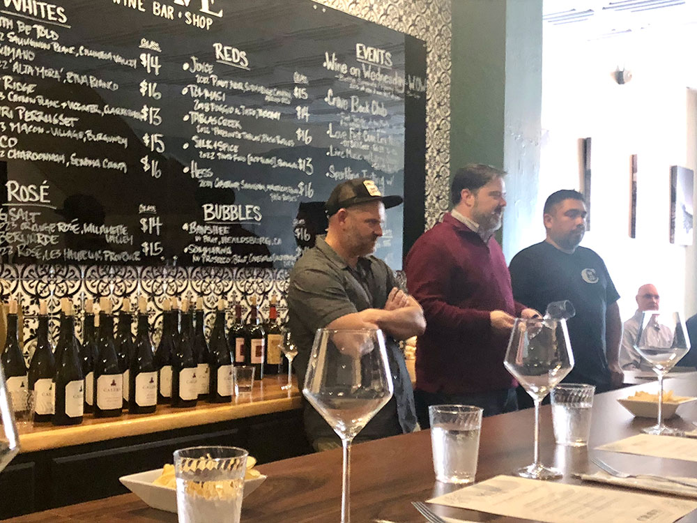 TASTING TIME Calera winemaker Mike Waller (left) with Crave Wine Bar owner Mike Kohne and bar manager Robert Galvan. PHOTO: Laura Ness