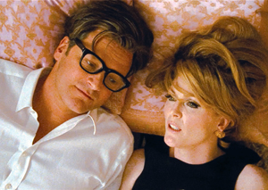 A HANDY WINNER of the award for Most Improved Performer of 2009 is Colin Firth, whose performance in A Single Man is a model of frosty yet sensitive acting. The film debut by director Tom Ford is beautiful, but it’s the kind of beauty that it’s hard to feel anything about. Ford is working from Christopher Isherwood’s novel, essential reading in the gay canon. But the designer-turned-director films as if he’s adapting a classic; the material doesn’t have any room to take on a life of its own. Firth plays professor George Falconer, an Englishman in Los Angeles in the early 1960s, when the Brits were still a novelty in that city. He’s a bereaved figure; being in the closet, he isn’t permitted to show his sorrow after the death of his longtime male lover in an automobile accident. (In flashbacks, we see the lover, played by Matthew Goode.) This single man’s secret is known only to his friend Charlotte, called Charley (Julianne Moore), also a former flame, who has never quite gotten over George.
