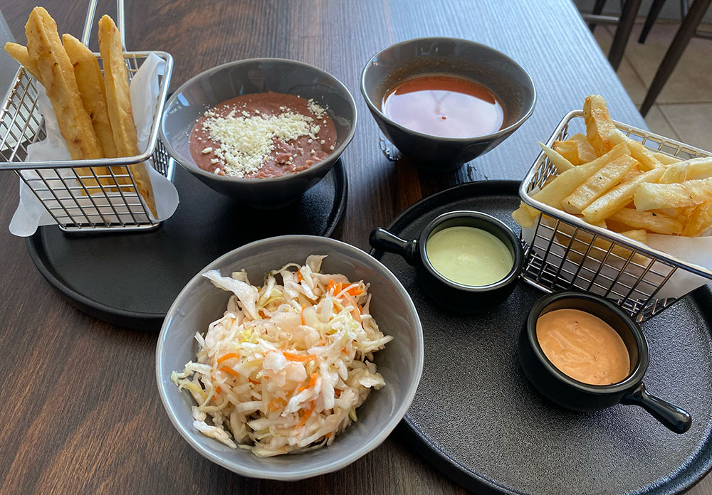 There are aguas frescas ($4.50) on the menu too, horchata and tamarindo. I tried something new to me, an ensalada drink. In this case, ensalada refers to a fruit salad, not one made with greens. It’s a virgin sangria fruit punch that’s pulpier than an agua fresca. Mine was a delicious mixture of pear, pineapple and mango laced with dark green blades of fresh mint.
