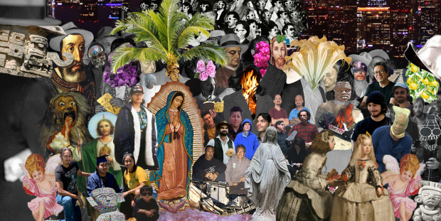 The collage on the book’s cover was also created by the author, a cosmic ensemble of symbols: palm trees, amethyst, Goya’s famous painting Saturn Devouring His Son and the Virgin of Guadalupe among them. Personal figures of Dominguez’s life—their mother, siblings and their self as a small child—stand among the pantheon of saviors and destroyers.