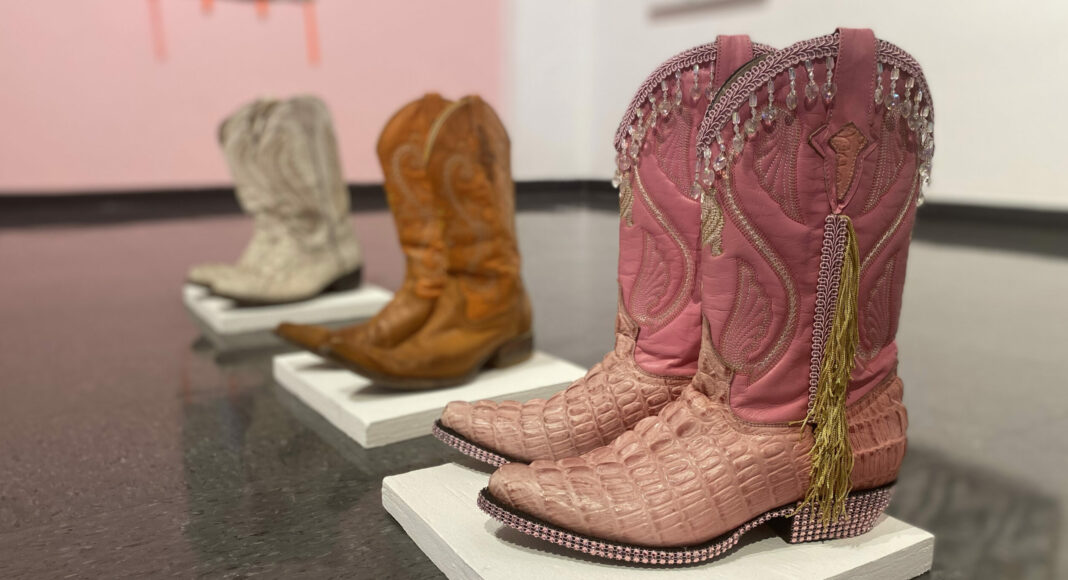 In José Villalobos’s series of paintings, a young boy receives explicit messages of emotional suppression from an older generation of men. In front of his paintings, a trio of cowboy boots seem to transform. The symbol of rugged masculinity is subverted by queerness, turned into an instrument of colorful gay expression.