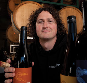 Hoey, now 29, is an exuberant man with tight, curly hair and a cherubic, ever-smiling face. He seems to realize his good fortune and is enjoying the ride. In 2004, he decided to make his own wine and Odonata Wines was born. He started with just 65 cases of wine—three barrels. Now he’s up to 2,000 cases. But he doesn’t want to get a whole lot bigger. He likes running a one-man show. This spring he’s going to open the doors to the tasting room to his own winery. Odonata currently occupies a back corner of Santa Cruz Mountain Vineyard’s densely packed winery.