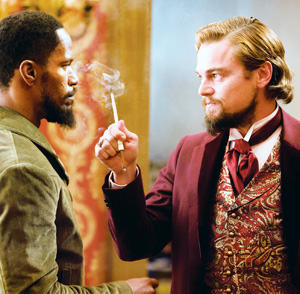 Django takes to the killing work with ease—”Shootin’ white folks, what’s not to like?Ó He has a mission of his own. His wife, Broomhilda (Kerry Washington), has been sold down the river by a cruel master (Bruce Dern). She’s languishing on “the fourth-biggest plantation in Mississippi,Ó a place known as Candyland, operated by the disgusting Calvin J. Candie (Leonardo DiCaprio). To infiltrate the place, Django will pose as a free black slaveholder seeking to buy bare-knuckle fighting Mandingos.