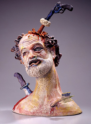 “Assassination of a Famous Nut Artist” (1971) is classic Arneson. Employing the format of the portrait bust, in this case a comic self-portrait, the artist mocks his reputation for bad-boy overkill; a pistol floats above the effigy, firing a round into its head.