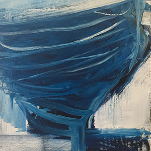 At Sea features a series of boats that are atypical of the nautical genre. No grand mast stands at attention in some 19th century shipping fleet or armada. There isn’t a hint of cloying, pastel sweetness or any calm harbor. The hulls are skeletal, in various stages of decomposition. Water is midnight blue, maroon or ravaged. The world depicted here cannot recover from the aftermath of a terrible storm. In their inexactitude, the ships of Alfred Wallis, the Cornish painter, come to mind. But even his muted tones look optimistic in comparison.