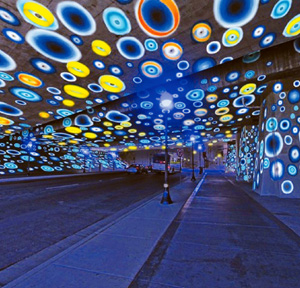 Now, things are different. After a limited competition to design an interactive zone, artist Dan Corson’s conceptual proposal for the underpass includes “halos” of LED lights that change color in response to the passage of people on the sidewalks.