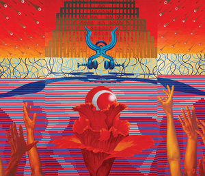 Social issues are diversely addressed, as in the ironic Universal Recipient—8 by Jitish Kallat, which uses a deliberately crude poster style, or the massive, slick colorist triptych Induced Epidemic, by Ashutosh Bhardwaj, which is mechanically precise and highly dramatic. Alexis Kersey’s ironic Lucky, Lucky, Lucky conjures Renaissance Mother and Child altarpieces, but framed in tantric skulls. Irony predominates throughout as an attitude—a global condition.