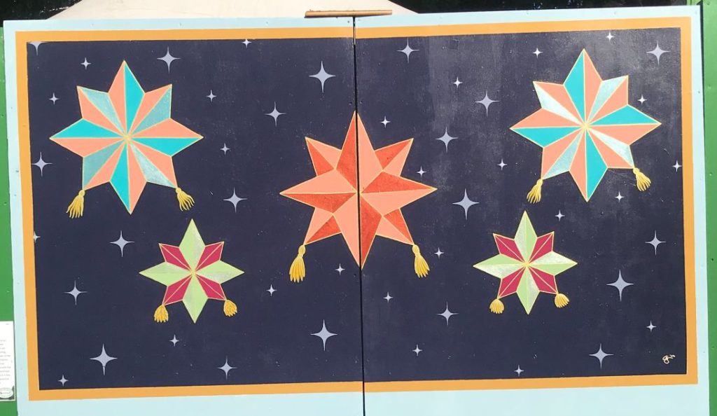 Alyssarhaye Graciano, in collaboration with her father, presents “Magandang Gabi Mga Bituin (Goodnight Stars),” a mural deeply connected to her cultural heritage. Exploring the significance of parols—traditional Filipino ornamental lanterns—the artwork exudes hope and family bonds, contributing a new layer of intentionality to their yearly visits to Christmas in the Park.