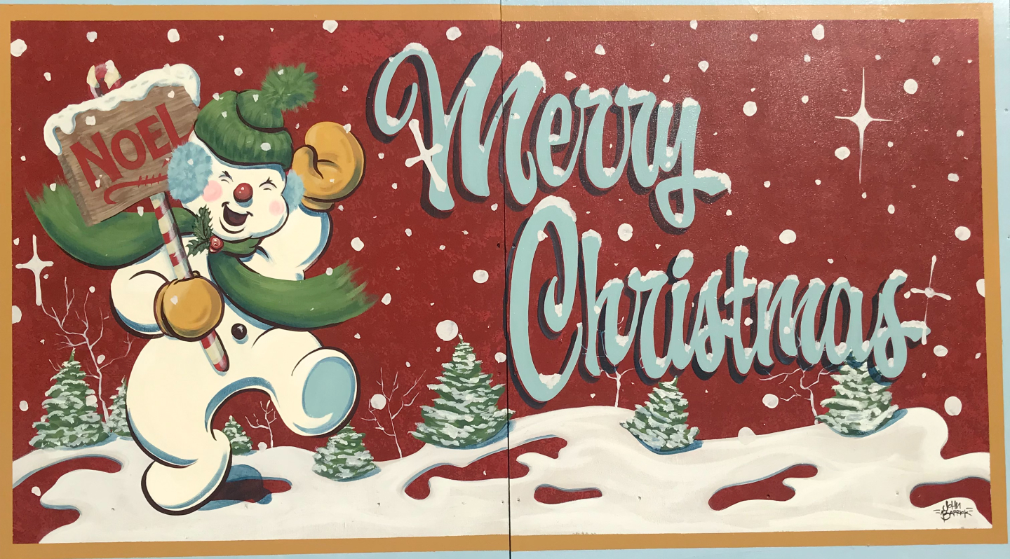 The colorful murals themselves serve as vivid testaments to the local artists’ unique perspectives on the holiday season. John Barrick’s “Noel” embraces nostalgia, drawing inspiration from whimsical painted windows seen in retail storefronts. The vibrant holiday hues and a humanized snowman convey the simple, replete joy associated with this festive time around Downtown San José.