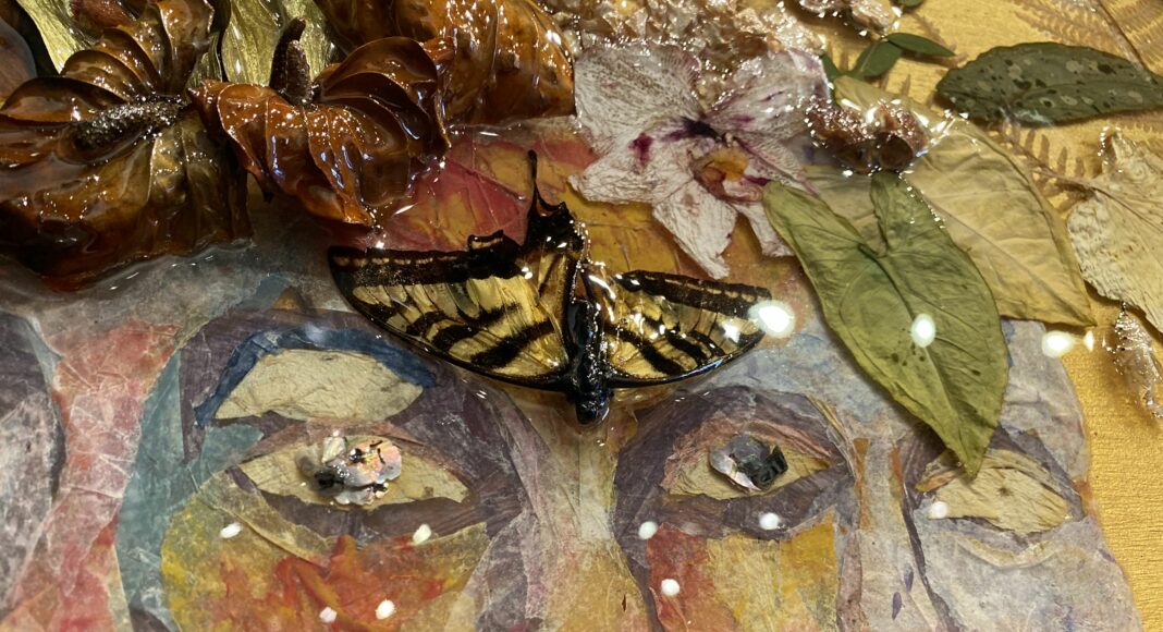 Ventura-based artist Vanessa Wallace-Gonzales says she was excited to have a place in the exhibit. Her works—which layer painted sheets of paper, resin, seashells and the delicate bodies of moths and butterflies—explore our layered identities and their connections to the divine and historical.
