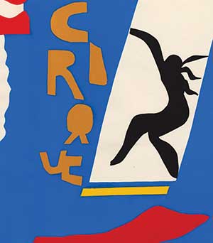 As the protective black tarp lifts from the glass cases before opening time at the Iris and B. Gerald Cantor Center for Visual Arts, the images of Henri Matisse (1869-1954) appear in front me. In the forms of jazz, clowns, nightmares, circuses, knife throwers, funerals and lagoons, these 20 spirited block-like representations occupy what looks like a secret room off one corridor.