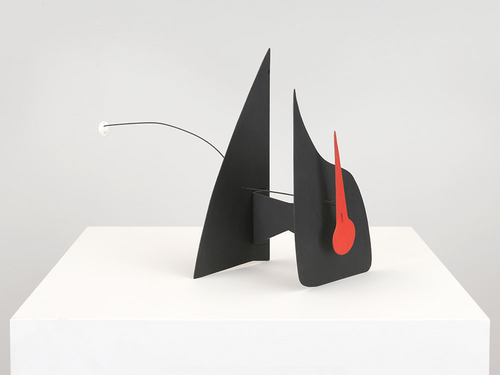 A few smaller colorful sculptures, made of sheet metal, wire and paint, capture the development of Calder’s imagination. They look like initial prototypes of grounded mobiles, before Calder raised them skyward, and iterations of the outdoor sculptures before the artist expanded their scale, mass and density.