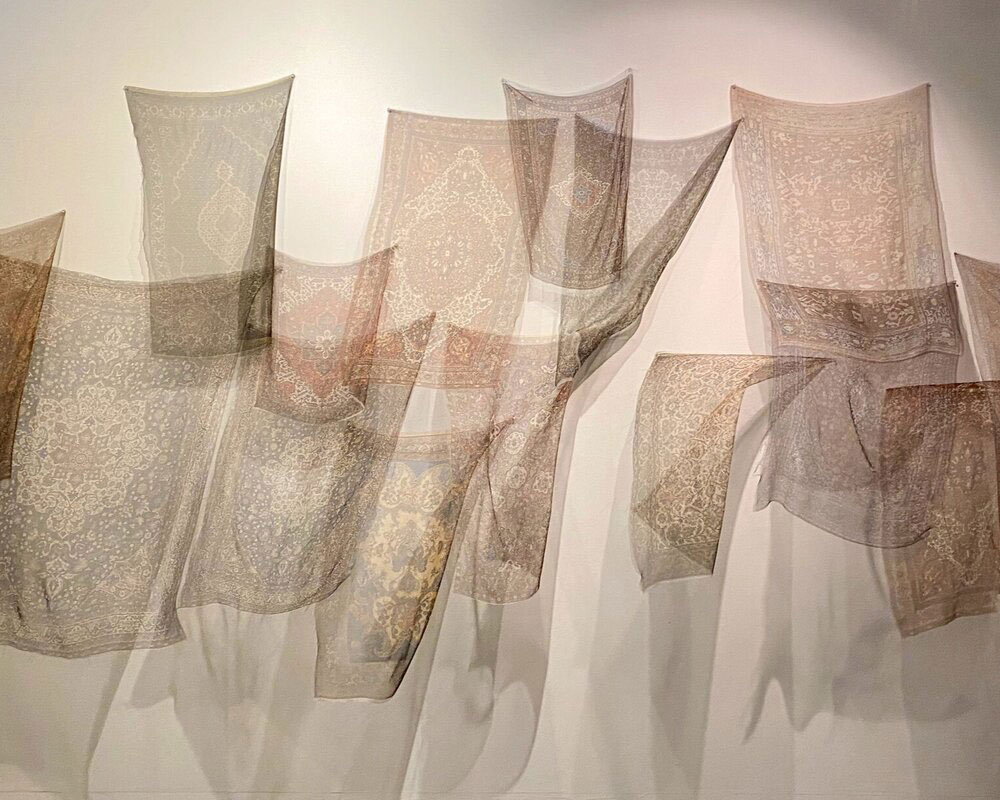 Shirin Towfiq extends the theme in “Looking for a Sign,” an assemblage of Sadaf brand tea bags that are stitched together and resemble a long sheet. Persian rugs are the most iconic examples of Persian art. Towfiq’s “Thinking About Migration” is an installation of 20-something prints of Persian rugs on gauze fabric that blow while a fan is on in the room.