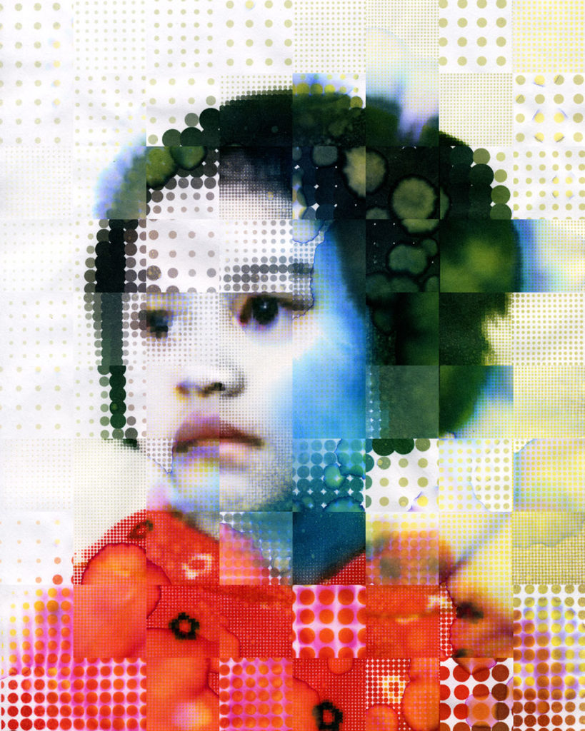 In the digital portrait Past/Future Tense, Hua explained that the layers are different iterations of the same image. “The aesthetic combines different ways that we create and see images,” he said. “I rendered the portrait with different dot sizes until they got progressively bigger, to the point where they almost got abstracted.”