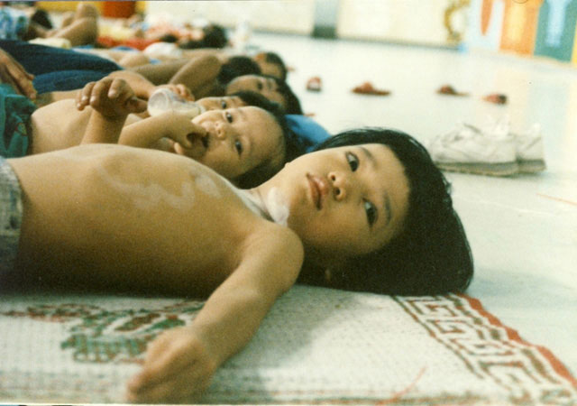 Children on the island of Chimawan off the coast of Hong Kong waiting for assistance. These are children of boat people who sailed East seeking escape from the new regime and who made it as far as Hong Kong. Chimawan was an island prison camp where thousands were kept while the world community attempted to find a solution to the flood of refugees from Vietnam.