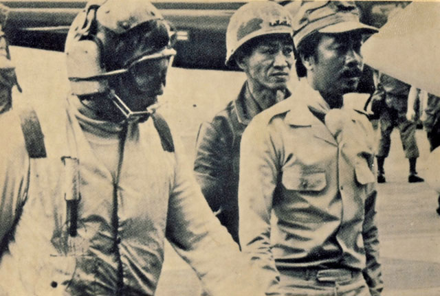 Generals Ngo Quang Truong, center in helmet, and Nguyen Cao Ky, arrive on the deck of the USS Midway on the morning of April 30, 1975. After announcing his plans to head the resistance against the North Vietnamese in Saigon and to turn it into another Stalingrad, Ky fled to the American fleet.