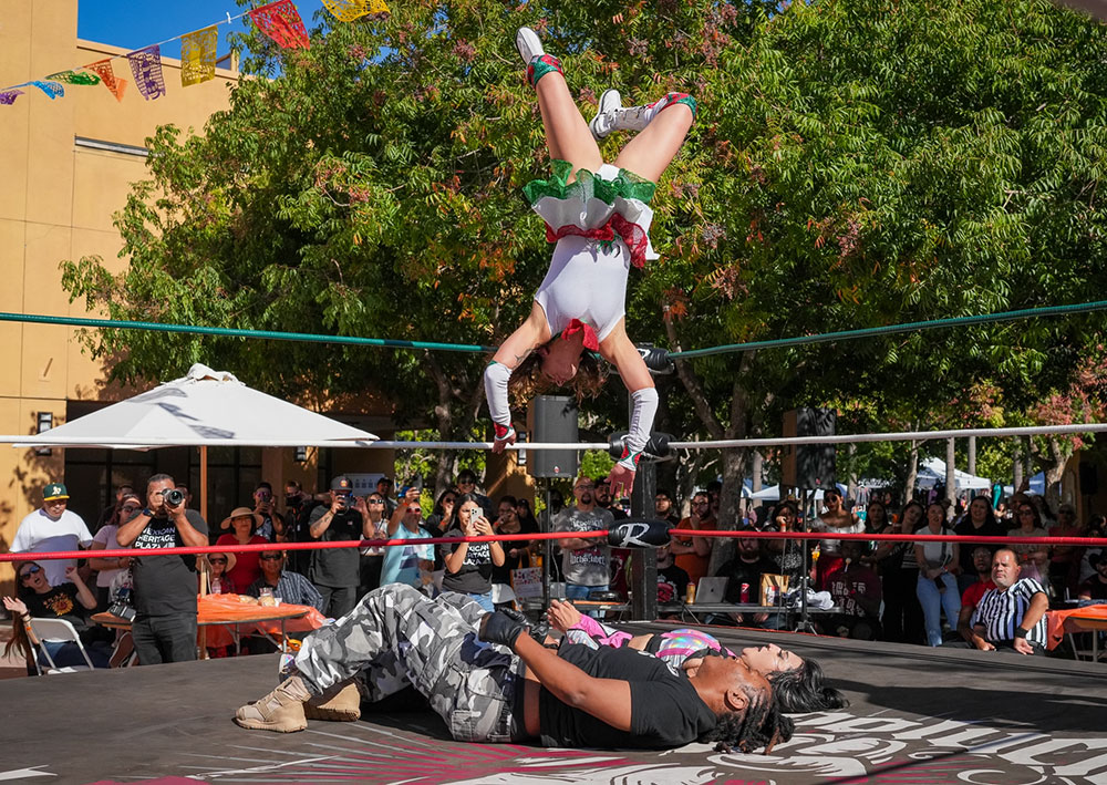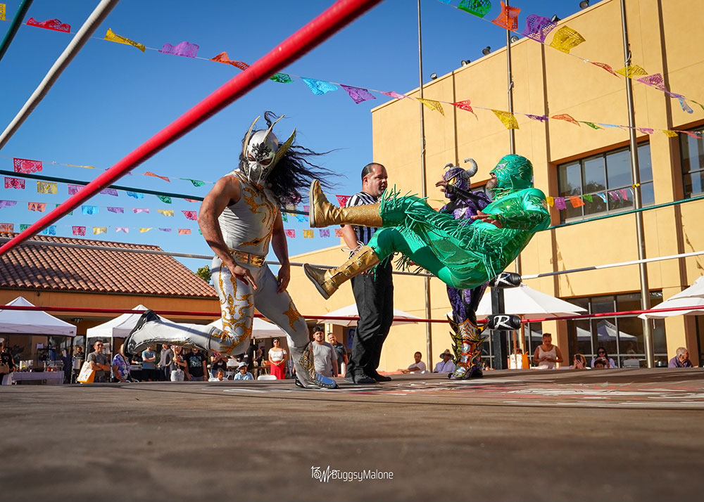 COMMUNITY SPIRIT Pro Wrestling Revolution stays busy, doing demonstrations at events like the Chile Mole Pozole Festival at the Mexican Heritage Plaza. Photo by Buggsy Malone