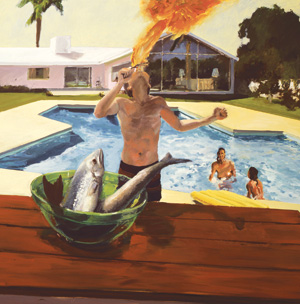 A boy is blowing fire up in the air like a circus performer while standing in front of a bowl of dead fish. Two naked women frolic in a ridiculously geometric-shaped pool. At the same time, a beaming ’80s version of Ward Cleaver works the barbecue with an orgasmic smile on his face.