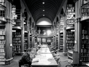 ROOM TO READ: Robert Dawson’s photograph ‘Woburn Public Library,’ from the Cantor’s show of works by Stanford teachers, recalled the glory days of architecture for the public good.