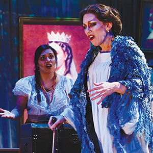 As a female antagonist and counterpoint to Carlota, Valdez summons Conchita to the stage. Acting as a spirit guide, she goads Carlota into confronting her ghosts, to have a final night of reckoning, like Ebenezer Scrooge on Christmas Eve. But Conchita isn’t free to dematerialize and leave. They’re imprisoned together in Europe and tortured by their shared memories of a distant Mexico. In her delicate voice, Oseguda sings a lovely self-portrait in song about an innocent dove. Like much else that takes place in Adios Mama Carlota, the song, and the genuine emotion it evokes, gets carried away by all that precipitous wind.