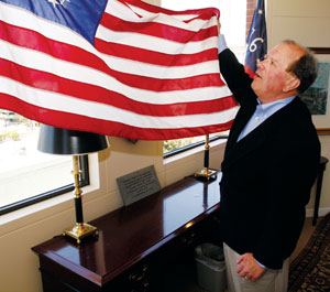 Framed prints and etchings relating to the Revolutionary War hang from every wall throughout the office: Washington crossing the Delaware, the surrender of Cornwallis, the Battle of Bunker Hill, the first reading of the Declaration of Independence and even one print of the Battle of Québec. Several flags hang from poles throughout the front rooms, including a Bennington flag, the only one with white stripes at both the top and bottom.
