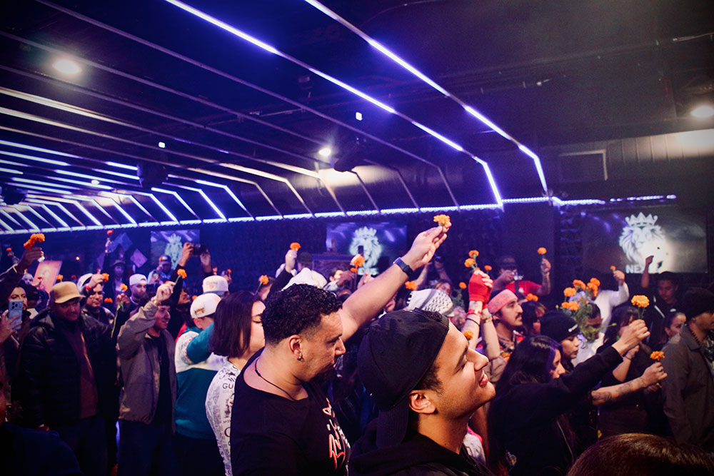 “What you normally see in prayer circles or danza, I wanted to bring it to the hip-hop stage,” Saucedo says. At the end of the night, he led everyone present in a final offering, holding up their marigolds as a symbol of what clarity they seek.