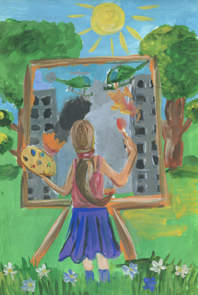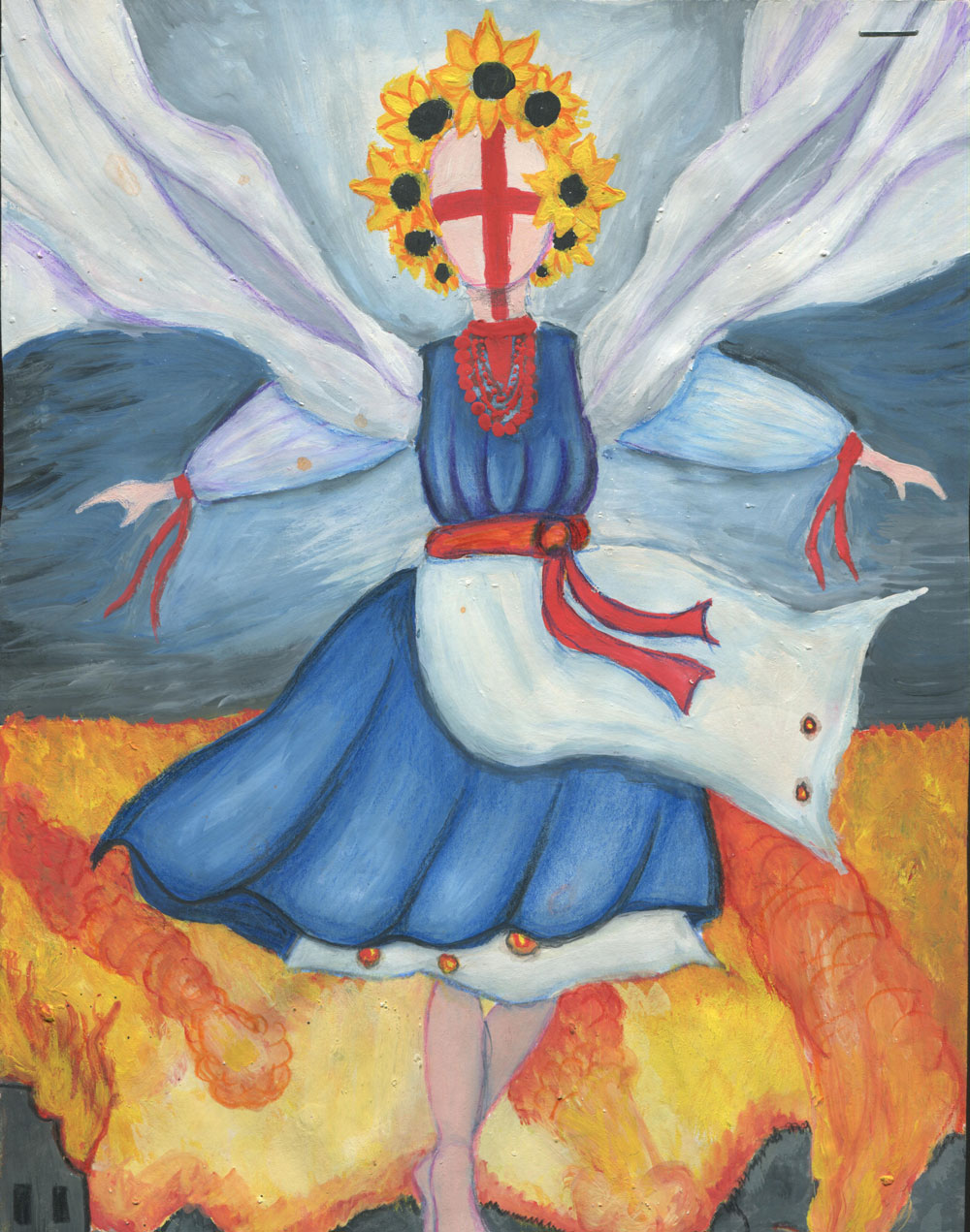One of the older children—Nazar, age 16—created a work that won plaudits from the Ukranian government. Titled “Guardian angels next to defenders,” the big historical piece shows Ukrainian soldiers next to famous writers, political figures from different times of Ukrainian history. The work stresses that Ukraine “not only has its own history, its own culture, but also a strong identity as a nation—and this is what the Russian government denies Ukraine,” Gosart says. “It was almost like a political statement, depicting all these components of history and culture that are significant for the nation to exist.”