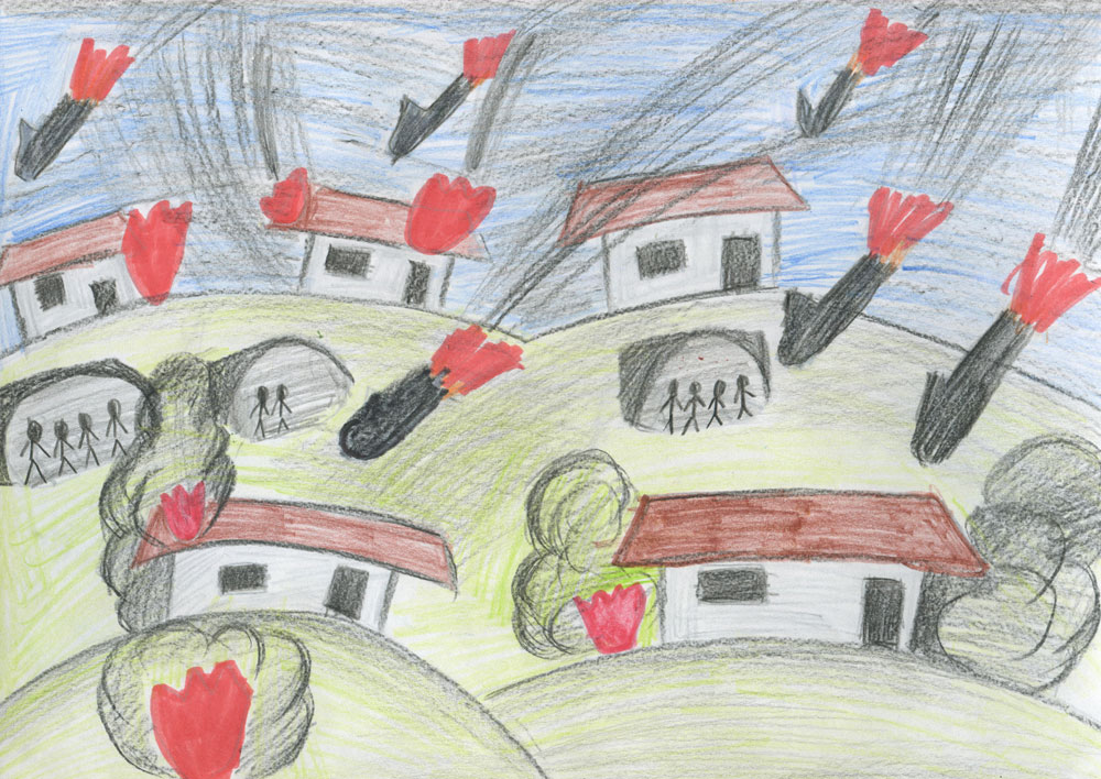 “Younger children draw weapons and battlefields,” Gosart says. “The older children have more complex depictions … more abstract. But little kids draw something they saw or experienced. To be able to actually have a physical connection with that historical evidence, by … thinking about this picture as something that has been produced a few years ago by a little child, is a very different way of understanding the war.”