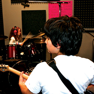 As I then skulk down those hallways, I see framed Agent Orange, Joan Jett and Creedence LPs gracing the walls, just outside the lesson rooms, of which there are many. I even get to prowl through two rehearsal rooms, replete with instruments, mics and soundproofing material. Throughout the building, I can hear kids running through Nirvana riffs, Concrete Blonde, as well as a complete group doing “I Melt With You” by Modern English.