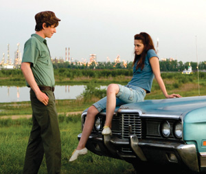 That’s about as much praise as The Yellow Handkerchief is going to get from this corner. William Hurt, doing his best to be Robert Duvall, shows a bald pate and a handlebar mustache as Brett, an ex-con who hooks up with a pair of mismatched runaways who are driving south in a vintage convertible. At the wheel is an oversensitive but artistic gawky kid named Gordy (William Redmayne, Angel Clare in TV’s Tess of the D’Urbervilles—a British actor adding to the dislocated quality of this independent feature). The other is Martine (Kristen Stewart), a neglected kid. Stewart’s newfound fame in the Twilight series got this film released. Once again, she’s pantomiming the kind of girl whose legs don’t seem to be the same length, who is shy about either her mouth or her teeth. (Taylor Swift’s parody of Stewart’s acting as lip-chewing on Saturday Night Live should really stop Stewart doing this in the future.) Martine is so underwritten, Stewart has to fill up the role with mannerism. And there’s enough mannerism in The Yellow Handkerchief already; despite near-constant momentum on the road, the film never seems to go anywhere.