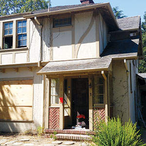 Now as I stand at those same front steps on July 30, the house is empty. But I see a vase of orange roses on the porch, a card that says, “Olivia,” and a second bouquet of flowers, perhaps left by grieving fans. Some of the yard foliage has been cleared, and the front window is boarded up. Upstairs, the smaller windows remain open to the elements. The whole place seems neglected.