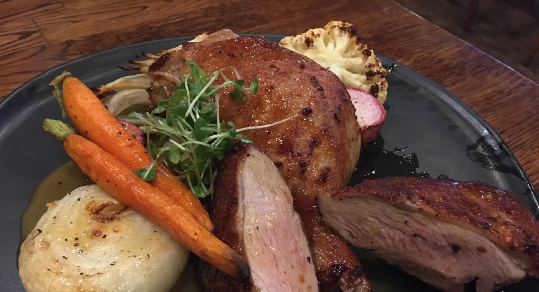 The restaurant describes itself as a sports bar due to the presence of a phenomenally large television. Mercifully, the screen was dark while we ate our meal, thus sparing us close-up scenes of coaches with hangdog expressions, tossed pigskins and multiple tacklings. There was another flat screen TV on, floating at the top of a high wall above the rows of liquor. In someone’s living room, that second screen would stand out as ostentatious.