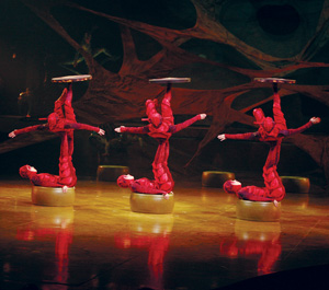 Red ant–costumed performers foot-juggle oversize slices of kiwi and corncobs, which they turn on their sides and use as congas—in between the so-called “Icarian games” during which they juggle each other. The incredible diabolo performer hurls his spool-like yo-yo nearly to the top of the tent. And the slack-wire walker Li Wei takes an upside-down ride on a tiny unicycle, which he operates like an eggbeater.