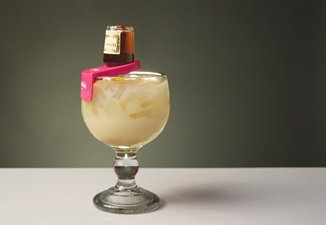 Not only did Mexico save uniformed horn bands from extinction after the Maximilian Affair, its national drink has rescued French brandy from becoming a Coke mixer promoted in bad hip-hop songs. The enabling technology that makes a Hennchata more than just another mixed drink is an L-shaped plastic clip that clamps onto the rim of a thick-walled, stemmed chavela glass. The patented device holds an upside-down airline bottle of liquor in place, with the alcohol suspended by gravity-defying laws of physics.