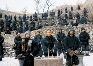 After the thieving soldiers withdraw, Pang urges the bandits to join the emperor’s army as a way of surviving the times. Pang, the bandit Zhao and the film’s narrator, Zhang (Takeshi Kaneshiro of Red Cliff), join in a three-way oath to fight together as brothers. They seal this oath with the murder of some hostages: blood in, blood out.