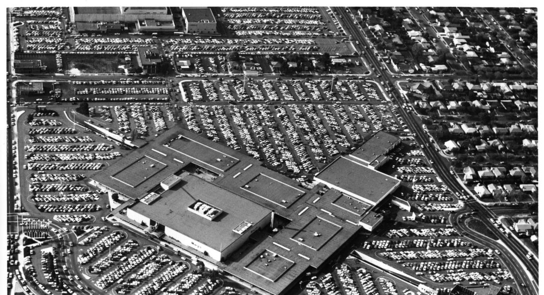 Nevertheless, suburban parking wars always make me laugh, so I looked up an aerial shot of the original Valley Fair, photographed decades ago by Arnold Del Carlo. Cars filled the parking lot like swarms of bees latching on to their queen.