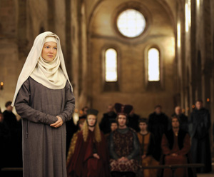 Yet the visuals are fresh and clear. A procession into the forest is free of the sense of actors in funny clothes (they look like they’ve got things on their mind, like a modern crowd does when it passes). Quick bursts of hand-held camera interrupt the slowness of life in stone walls. The colors have a warm muted glow; the midnight blue habits and cream-colored draperies on the sisters aren’t pretty-pretty, but they are inviting to the eye.