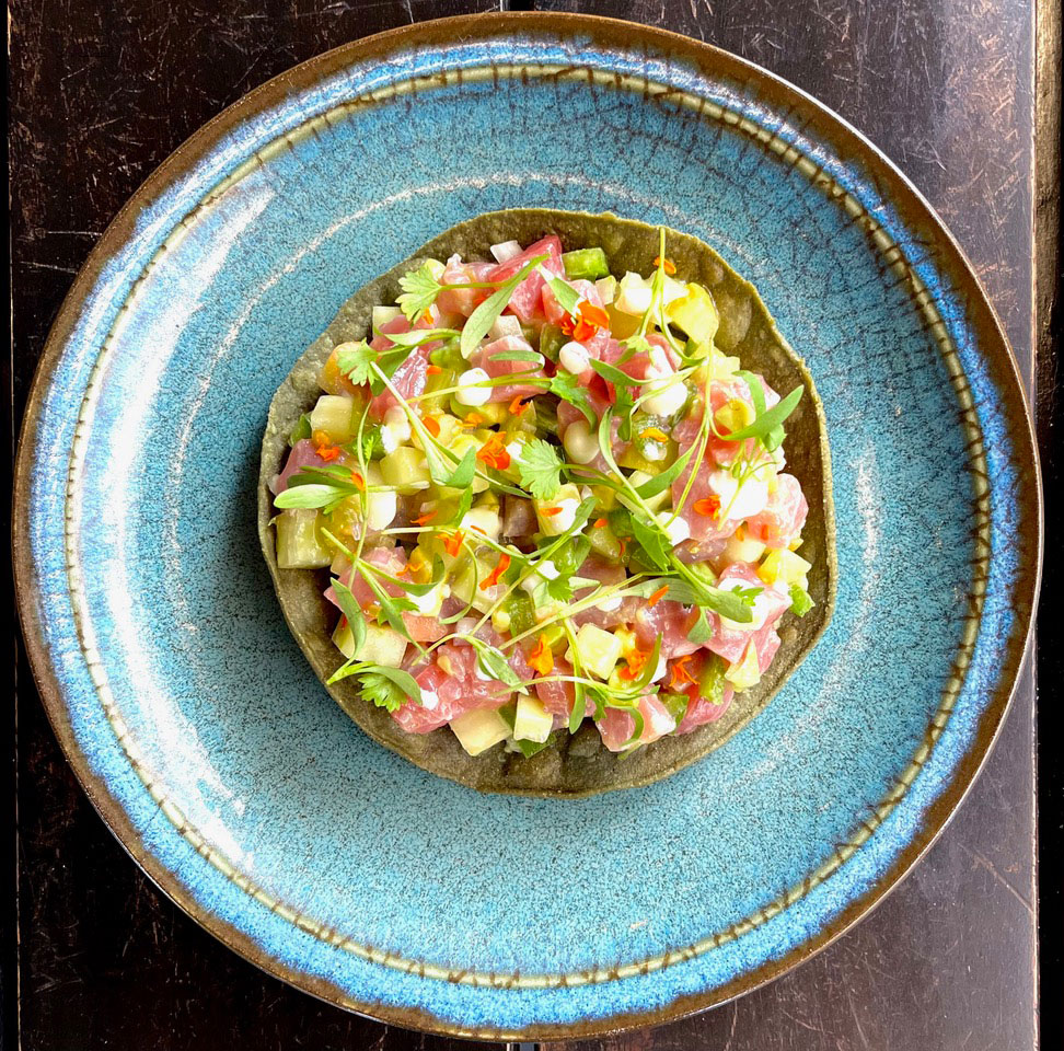 Carreon focuses on no more than three or four ingredients per dish, using prime produce from various farmers markets, at which he and his team shop several times weekly. Among the current menu items reflective of this philosophy are a chicken liver mousse with blackberry jam and pickled cipollini onion, served with toasted levain; local yellowfin ceviche on blue corn tostada with Thai chile mayo, herbs and flowers; Fogline Farm chicken with romesco, green lentils, mustard greens and sofrito; and assorted summer beans with olive oil chile crisp, puffed grains, seeds and nuts.